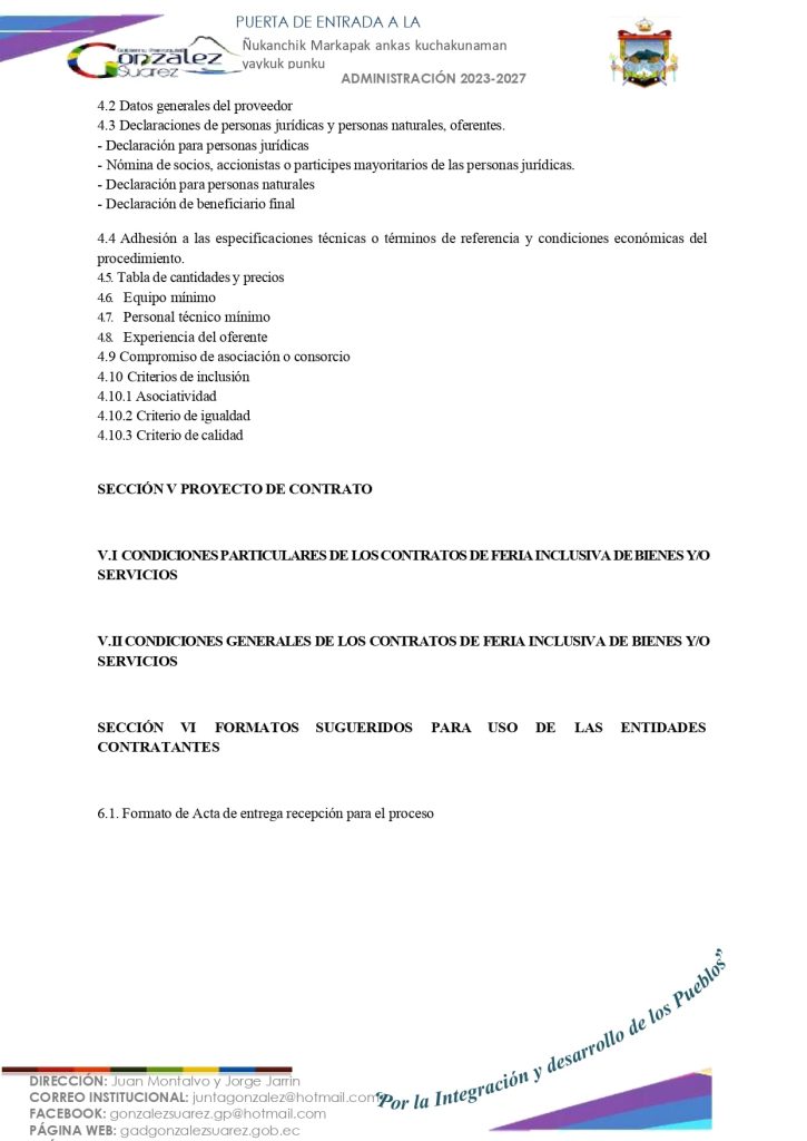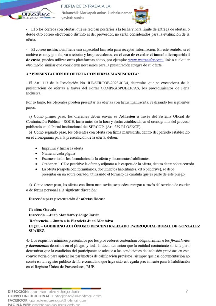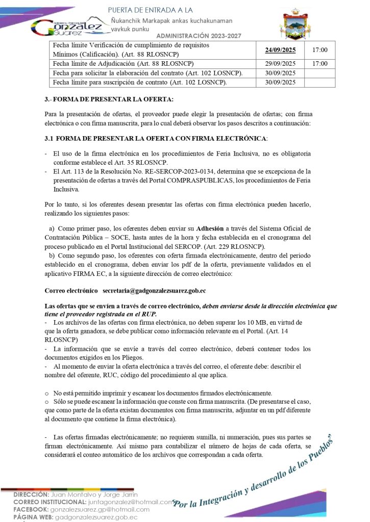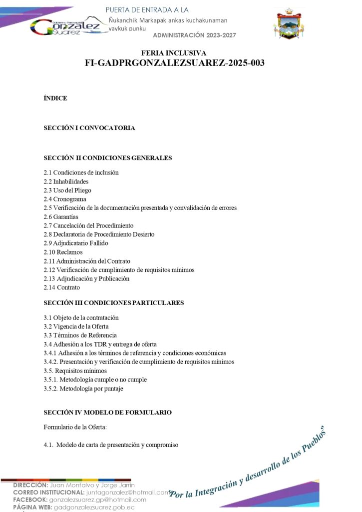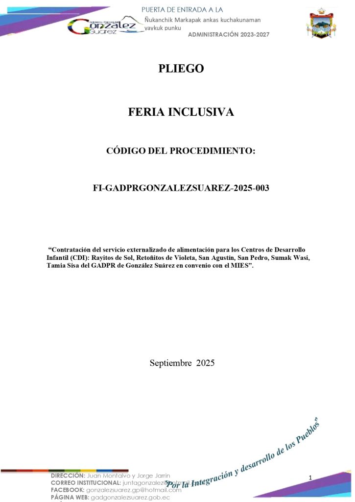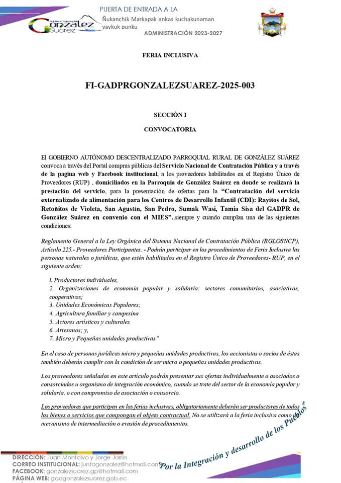 El GOBIERNO AUTÓNOMO DESCENTRALIZADO PARROQUIAL RURAL DE GONZÁLEZ SUÁREZ convoca a través del Portal Compras Públicas del Servicio Nacional de Contratación Pública y a través de la página web y Facebook institucional, a los proveedores habilitados en el Registro Único de Proveedores (RUP), domiciliados en la Parroquia de González Suárez en donde se realizará la prestación del servicio, para la presentación de ofertas para la «Contratación del servicio externalizado de alimentación para los Centros de Desarrollo Infantil (CDI): Rayitos de Sol, Retoñitos de Violeta, San Agustín, San Pedro, Sumak Wasi, Tamia Sisa del GADPR de González Suárez en convenio con el MIES».